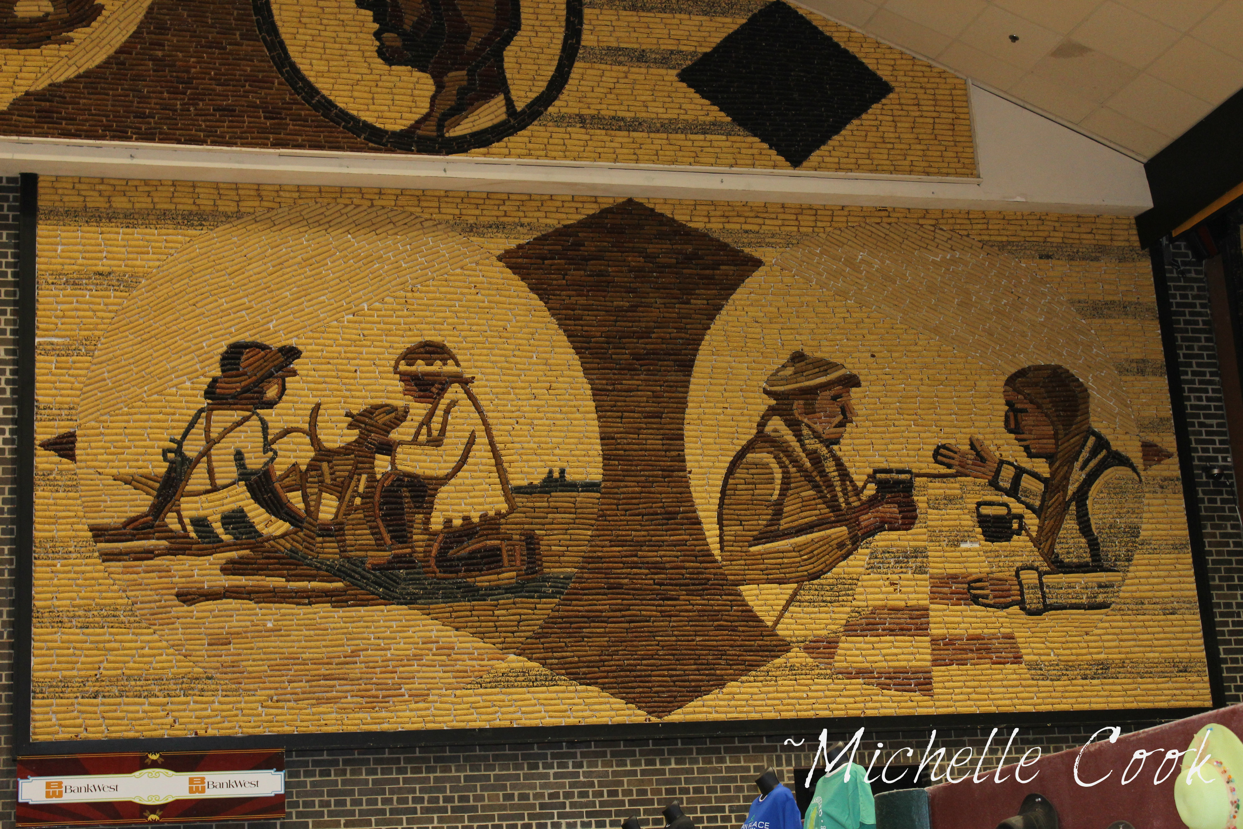 About 20 rest stops later… we are finally here in Mitchell, SD. We head over to our hotel which is a Comfort Inn. The place is pretty nice and the bed feels comfortable as I sprawl on top of it in happy revelation that we finally made it here. We decide not to lug all of our stuff in right away and head out to find the Corn Palace first. We don’t want to miss our opportunity to see this wonderful sight and were afraid it may close early. After taking a few wrong turns, we finally find it amidst the crowded buildings in the downtown area. It’s muggy outside, there’s road construction going on, and we aren’t quite sure where to park. Eventually we find a public parking lot across from the Corn Palace and park the car. I am grateful that we have finally made it here and just want to see something exciting and take lots of pictures. I am a little disappointed at first glance to see that they aren’t finished with the new exterior of the Corn Palace. Every year they change the theme and designs. Once inside the Corn Palace we are able to view pictures of the Corn Palace from all of the prior years. A Corn Palace Video blares in the distance, explaining the story of the Corn Palace. There’s a gift shop in the middle of a stadium seating area that gets our attention. We walk around the place for a while and discover some interesting facts. We learn that over 275,000 ears of corn are used each year in redecorating the Corn Palace and that all the colors of corn are naturally grown from special seeds raised just for the Corn Palace. Each color is apparently planted in separate fields to maintain its pure color and the Corn Palace Festival Committee selects a new theme each year.