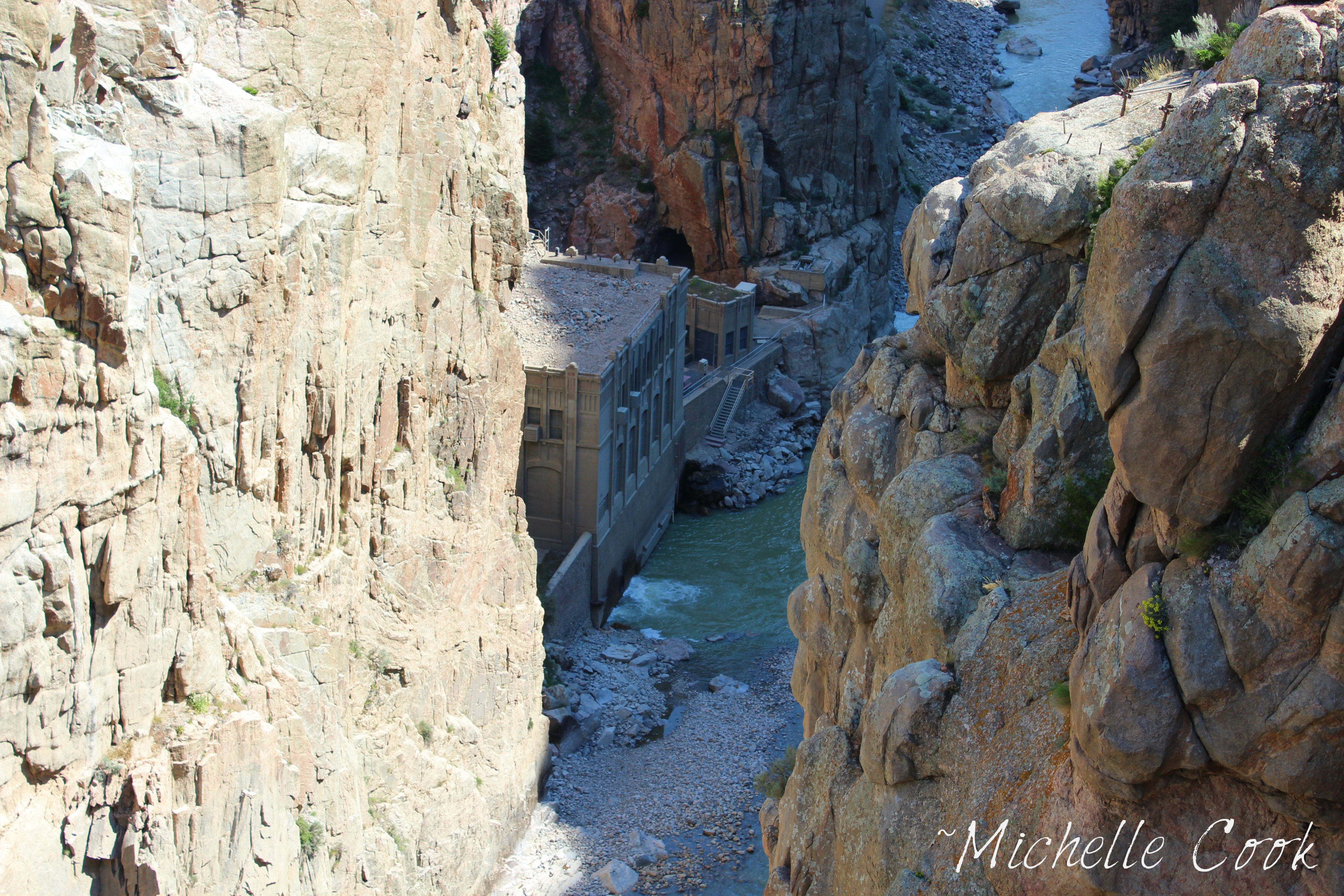 IMG_0369 copy for WPAfter driving a little farther down the road, we are now at a place called “Shell Falls.” I can hear the roar of the falls up ahead and run to get a better look. I am now standing in front of the 120 ft. high falls. The water is hitting the granite rocks in the bottom with such force, that the water is spraying back up into the air, forming rainbows in the streaming sun-rays. I didn’t think that anything could compare to the beauty of what we had just seen by the lake, but now I am not so sure. We look around and notice some short hiking trials and decide to explore even more. After taking a million photographs, we head back to the car to continue on our journey.  About an hour has passed and we decide to stop at a visitor center. IMG_0414 copy for WPIt feels good to stretch our legs after our long journey and we walk up to a large dam that overlooks a beautiful lake. After a short tour through the visitor center, we are on our way once more. Shortly after, we drive past a strange looking house, overlooking the road from the top of a hill. IMG_0426 copy for WPThe house looks abandoned and Brian decides to take some pictures. The house leaves us wondering about the history behind it.