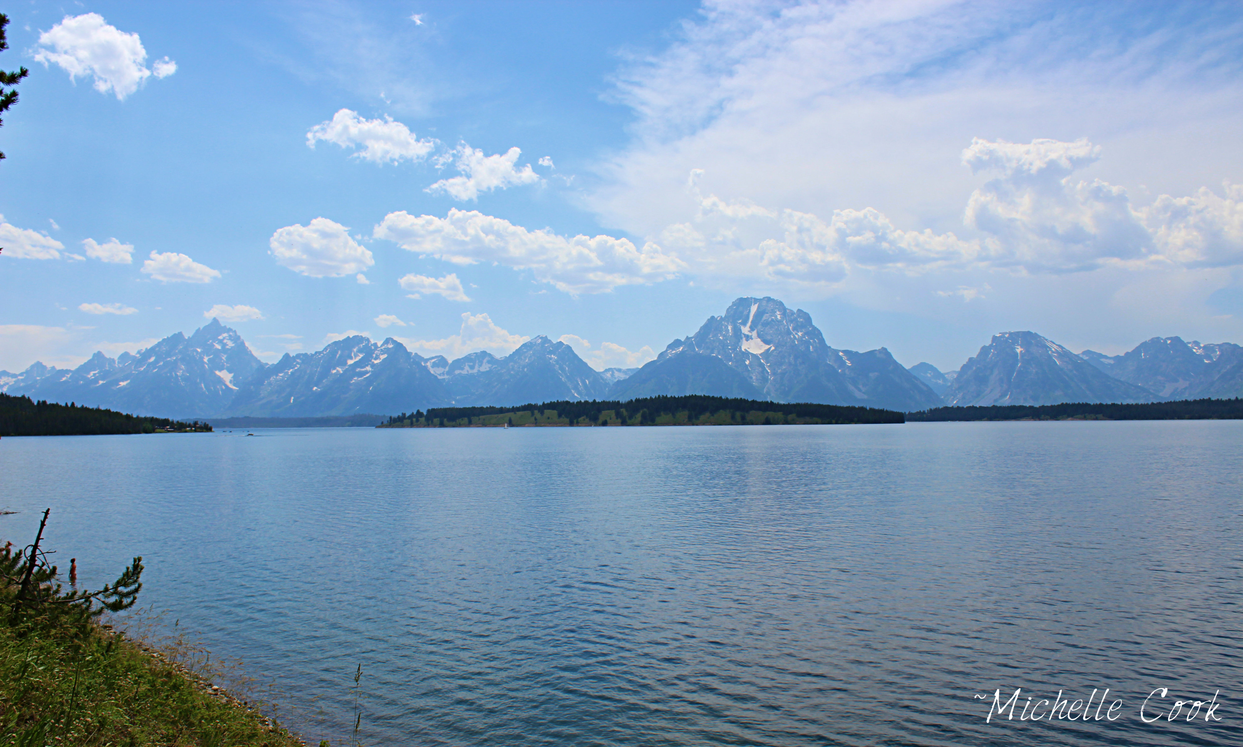 As we continue on, the Grand Tetons come into view and I am relieved that these mountains are still as beautiful as I remember. Along the way, we find a stopping point near a lake and hike up above a small beach to get a better view. IMG_0505 copy for WPThe mountains look hazy in the background, because of the humidity. People are laughing and having a good time; some are standing over by a small dam, taking pictures and playing in the water. Then there are a few people down below on the beach, playing in the sand. We have found our own little spot, up and out of the way, but I still find myself wishing that we were alone again, like we were this morning at the lake. It has been such a long day and the hours of driving are starting to wear on us.